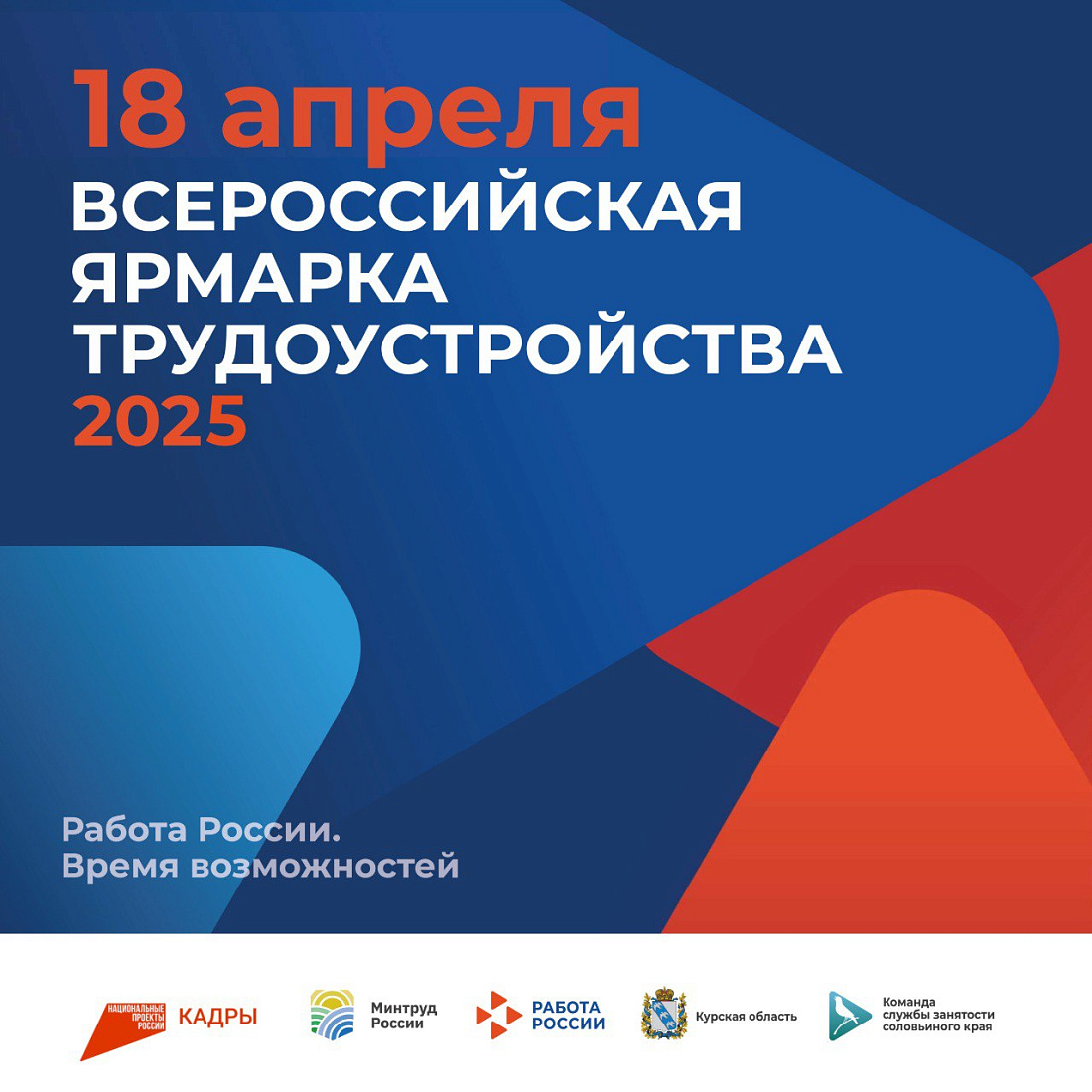 В Курской области стартует Всероссийская ярмарка трудоустройства «Работа России. Время возможностей»! Самое яркое кадровое событие года по традиции пройдет в два этапа: региональный – в апреле и федеральный – в июне. 18 апреля для ищущих работу граждан будет организована онлайн-трансляция Всероссийской ярмарки трудоустройства с участием крупнейших работодателей региона.