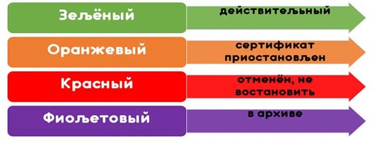 - фиолетовый — в архиве. Сюда попадают все сертификаты, чей срок годности истёк. По требованию законодательства документы должны храниться в архиве ещё 10 лет после окончания срока действия.